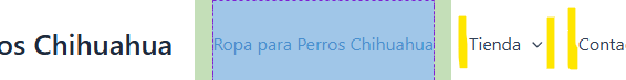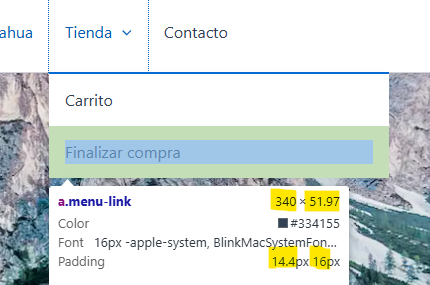 Los elementos en submenús, utilizan relleno (Padding) de 16px para los laterales y 14px para arriba y abajo, como se muestra en la zona verde, tratar de cambiar estos valores altera las medidas del menú superior, por lo que no se recomienda a menos que sea muy necesario.